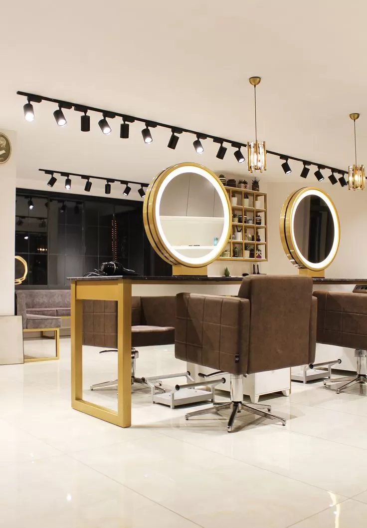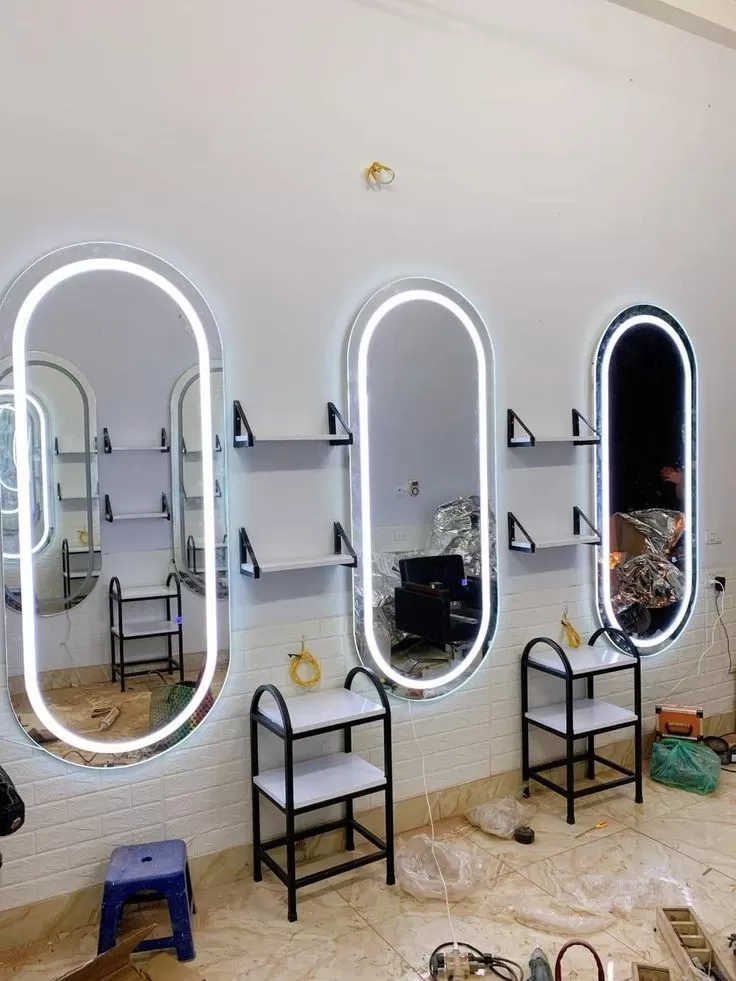 Một chiếc gương có đèn LED không chỉ giúp ánh sáng hài hòa mà còn tạo nên vẻ sang trọng – hiện đại cho salon. Đèn LED chạy viền tạo điểm nhấn nổi bật, tăng cảm giác chuyên nghiệp và cao cấp.